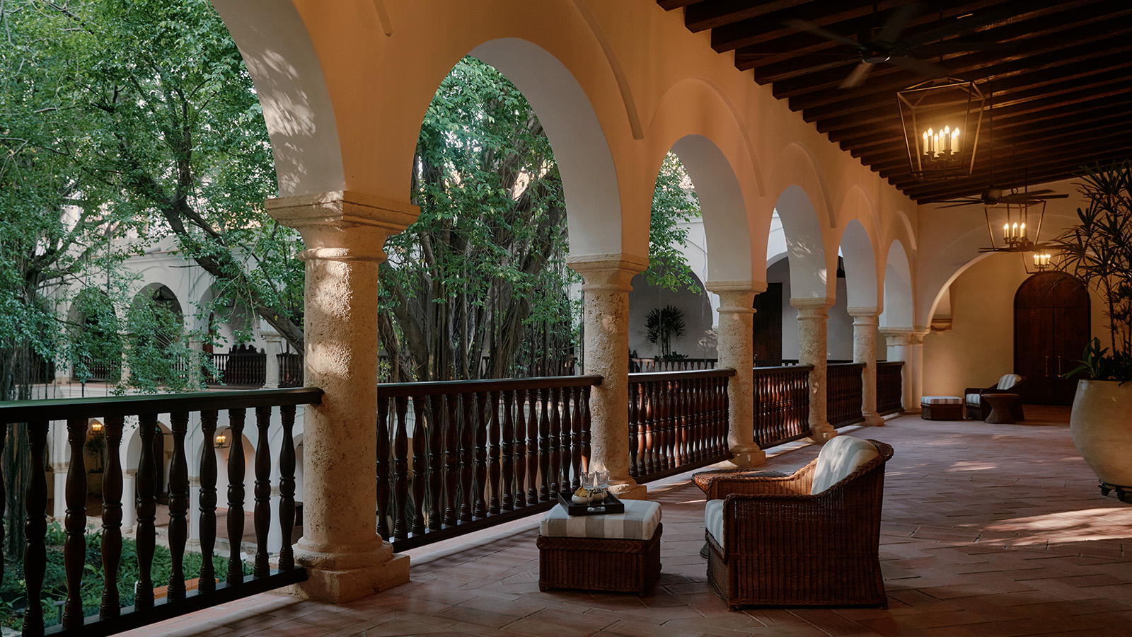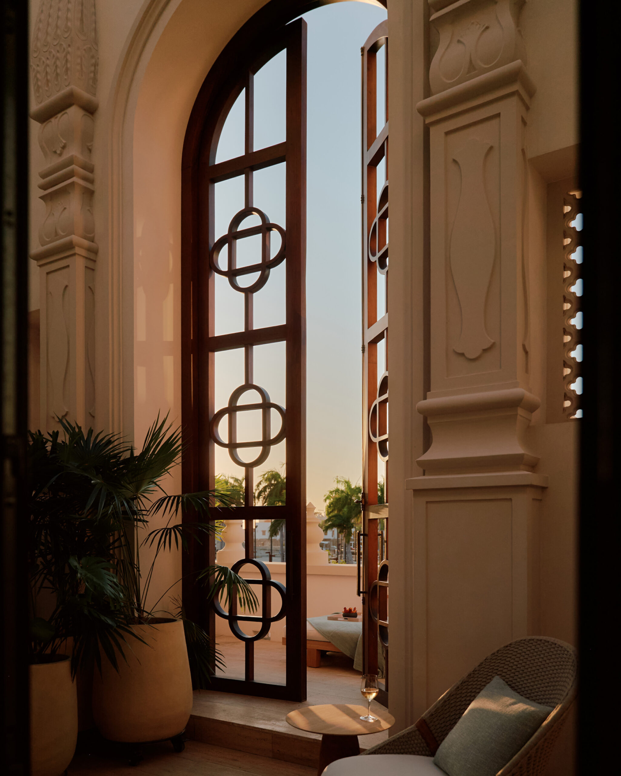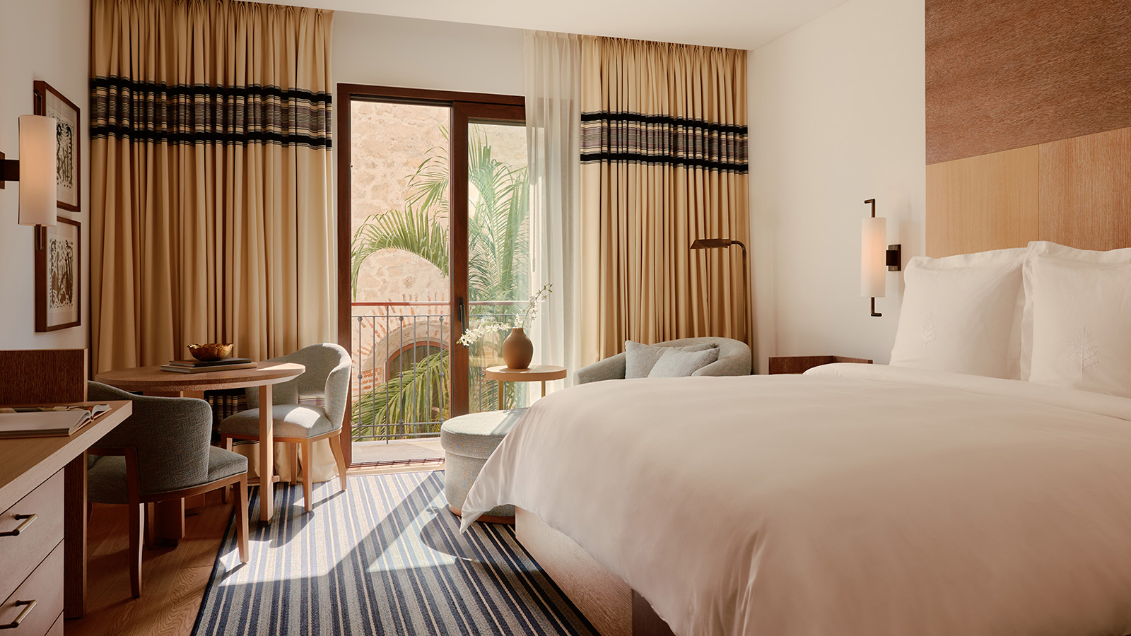 The 131 guest accommodations include 27 colonial-style rooms and suites in the heritage buildings. At the top of the collection sits the Catroux Suite, a two-bedroom presidential suite with private elevator access and a handcrafted Moorish-inspired ceramic fountain by María Cecilia Franco Berón on the furnished terrace.